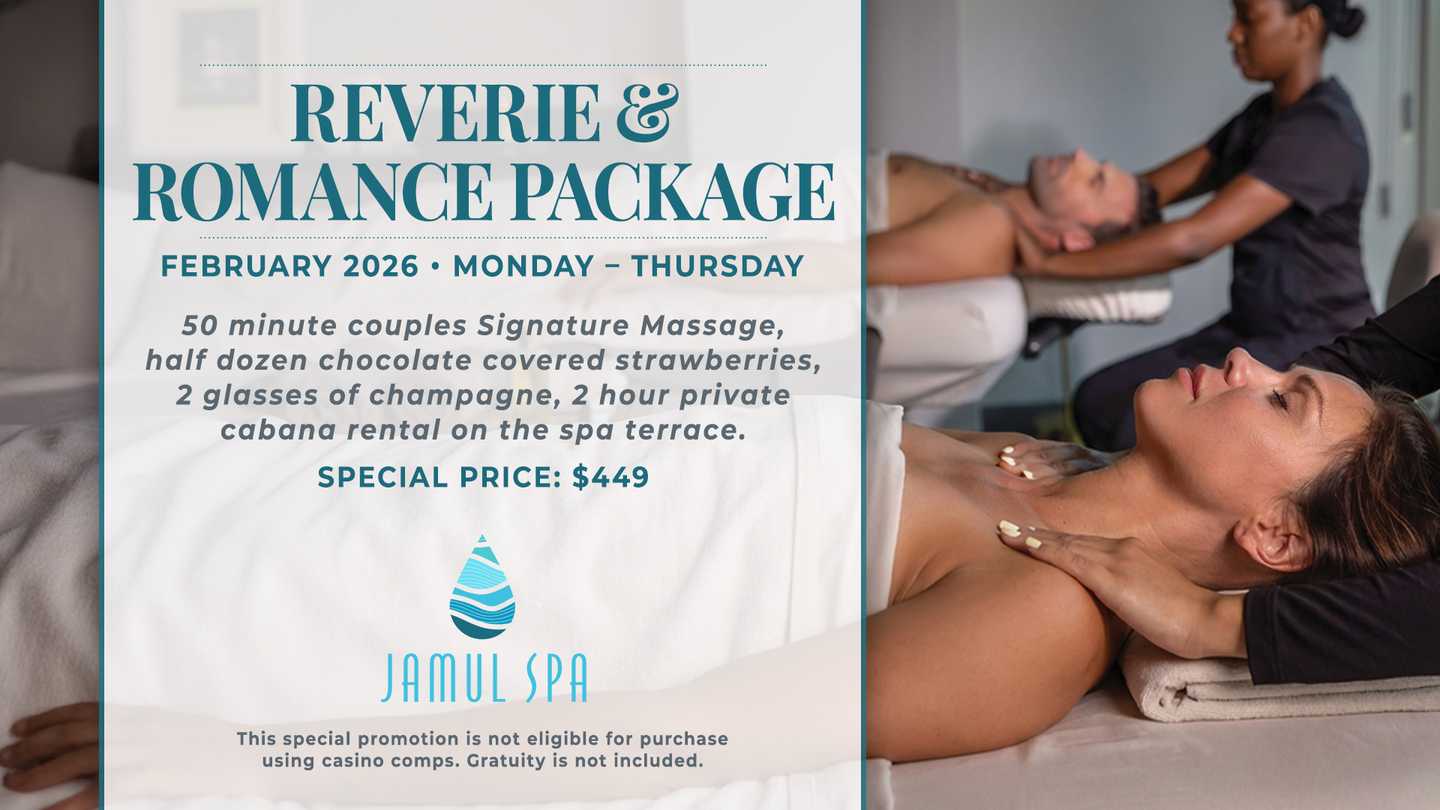 Enjoy a 50 minute couples Signature Massage, half dozen chocolate covered strawberries, 2 glasses of champagne, 2 hour private cabana rental on the spa terrace.